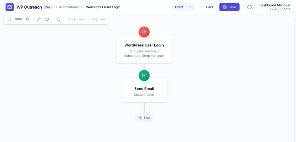 Important: The inactivity filter is key for re-engagement campaigns. Without it, the automation would fire on every single login, which is usually not what you want.